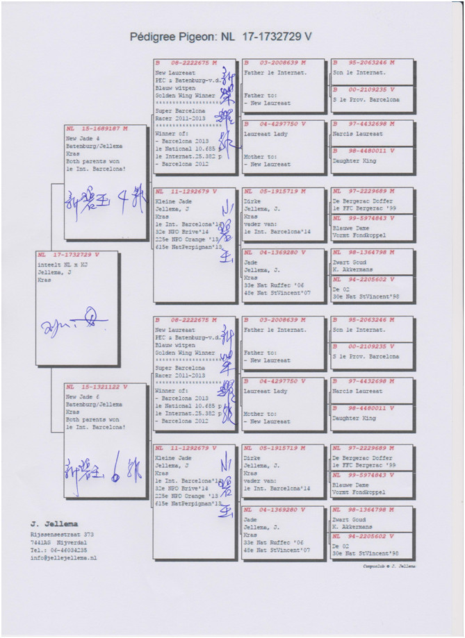 2016年波品納荷蘭全國(一歲鴿)季軍,國際賽12.689羽5位。