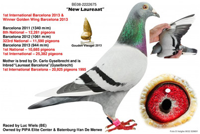 2013年巴賽隆納國際25.382羽總冠軍(分速944米/分)未達1.000公尺是場艱難的競翔比賽。