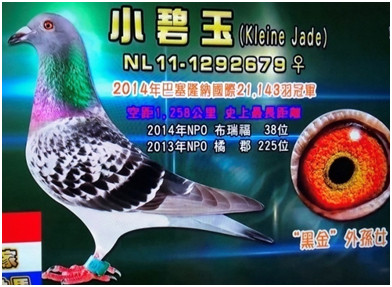 ~ “小碧玉”在2014年巴賽隆納賽上,僅以20個小時多就完成了1258公里的比賽。比賽於早上9點鐘放飛,她在翌日淩晨5:14歸巢打鐘。