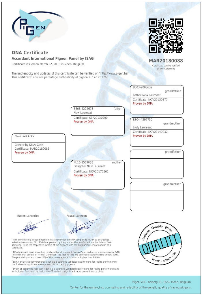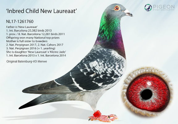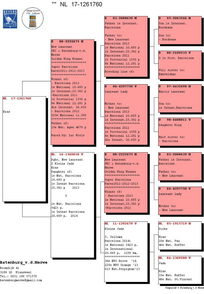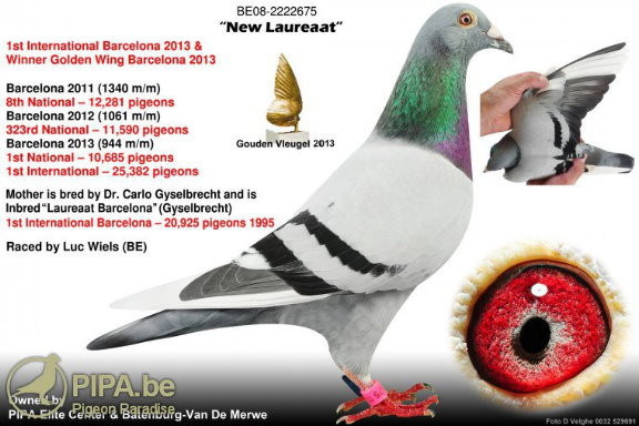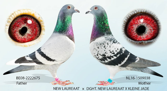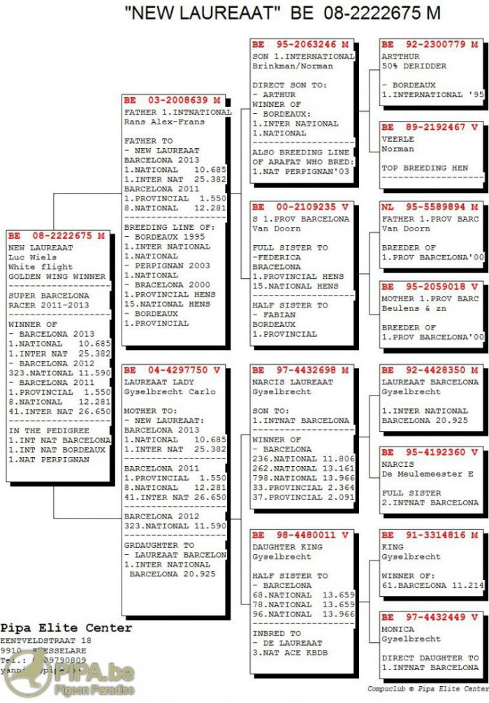 —其母親B04-4297750 "榮耀女士"出自吉塞布賴特的傳奇大銘鴿"巴賽隆納榮耀號"B92-4428350灰白羽公的一羽直孫女,"巴賽隆納榮耀號"榮獲:1995年巴賽隆納國際20.925羽冠軍。