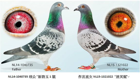 "新碧玉1號"是2羽巴賽隆納國際冠軍組成的傑出育種配對"新榮耀號"X"小碧玉"的直子,查看他的血統書。不用說這羽雄鴿具備了父母的很多相同特徵。