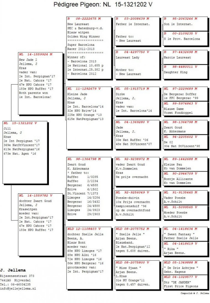 "吉爾"、"斯蒂芬妮"和"萊昂"的母親NL14-1559782為耶勒的天賦種鴿"黑金"直女。