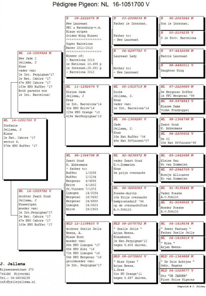 2016年波品納荷蘭全國(一歲鴿)季軍,國際賽12.689羽5位。