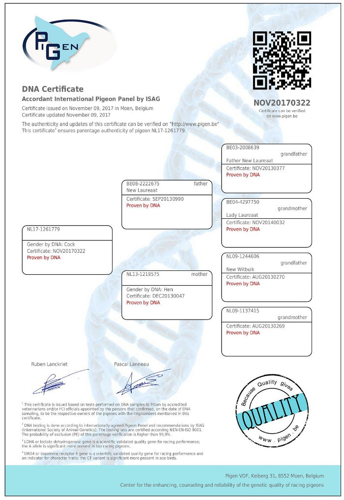 最令人印象深刻的成績來自"達芙妮"(NL15-1321022 Dafne),本身獲得波品納全國季軍(國際12,689羽)5位。"達芙妮"出自"新榮耀號"X 2014年巴賽隆納國際冠軍"小碧玉"(NL11-1292679 Kleine Jade)的孫代。"達芙妮"的母親出自耶勒.耶勒瑪著名的 "黑金"。查看"達芙妮"的完整血統書
