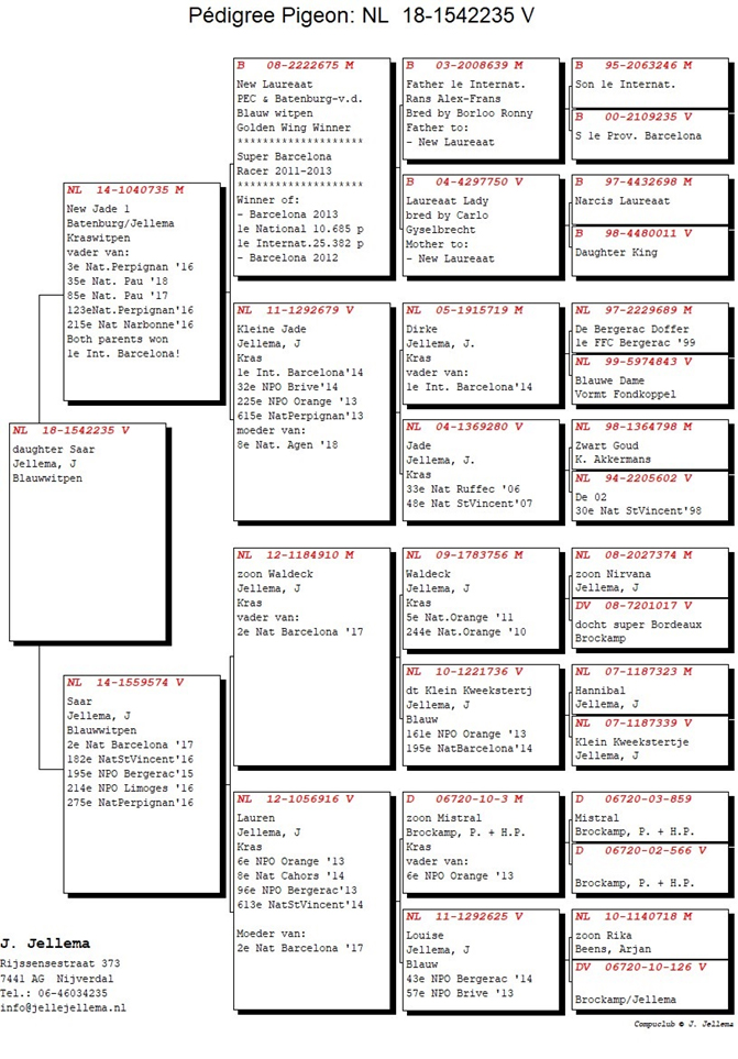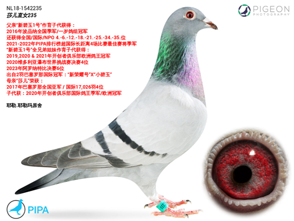 父親“新碧玉1號”是頂尖種鴿,出自2羽巴賽隆納國際冠軍“新榮耀號”x“小碧玉”