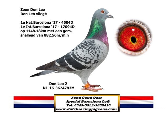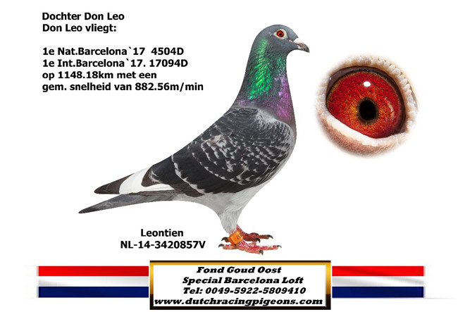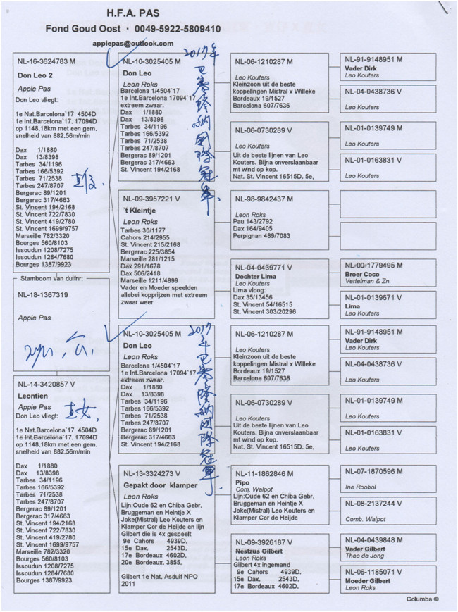 ● 祖父鴿:NL10-3025405斑公 ”蘇美爾戰將”,獲得2017年巴塞隆納國際17.094羽總冠軍鴿(是歷年最艱難的一次巴塞隆納國際賽)。