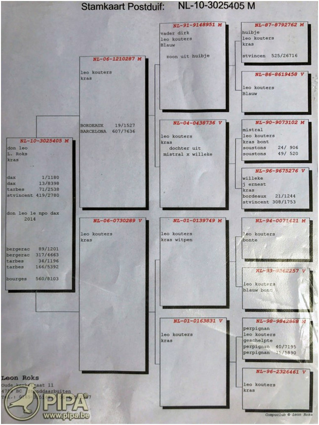 外祖父鴿:NL10-3025405斑公 ”蘇美爾戰將”,獲得2017年巴塞隆納國際17.094羽總冠軍鴿(是歷年最艱難的一次巴塞隆納國際賽)。