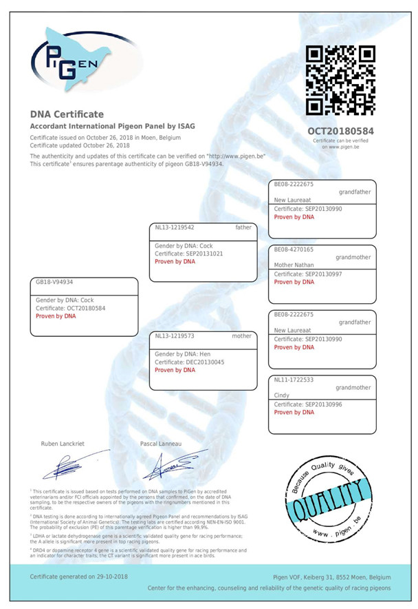 “新榮耀號934” GB18-V94934 班公 D.N.A.檢驗證明書