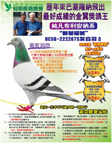2018年波品納全國3,966羽5位 (帕斯卡.赫林克斯使翔) – “新榮耀號”之孫代。