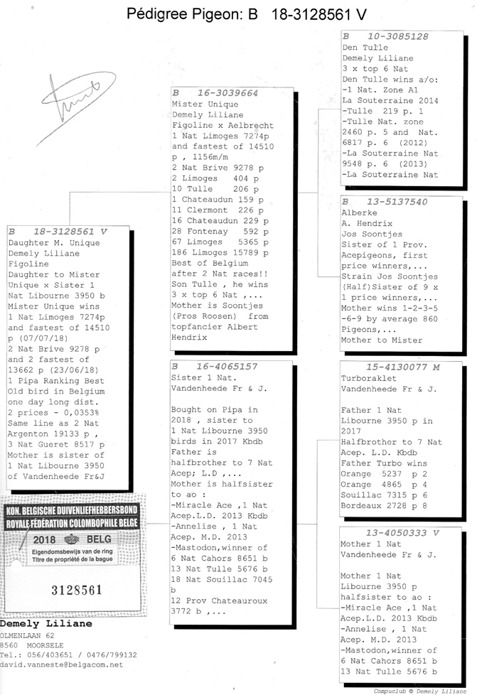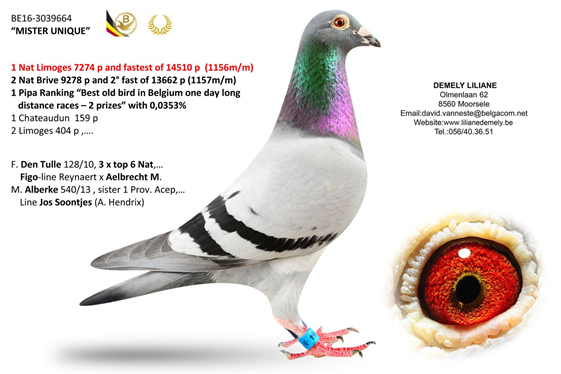 父鴿:B16-3039664灰公”獨特先生” 2018年利蒙治全國14.510羽冠軍,布瑞福13.662羽亞軍。