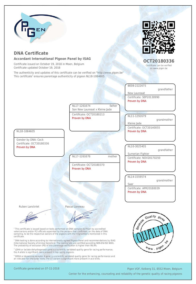 “新榮耀號605” NL18-1084605斑白羽.公. DNA檢驗證明書