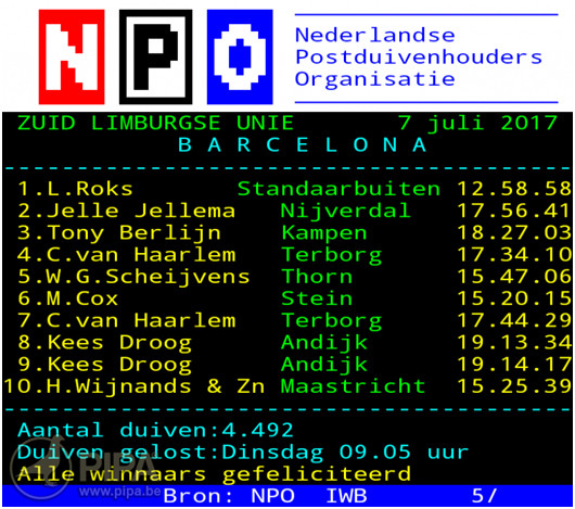 耶勒.耶勒瑪再次展示他強勁的實力,雖然他鴿舍的地理位置比較偏遠,但是他在巴賽隆納賽上大獲成功。他上籠的鴿子有21羽,其中的11羽獲得了頂尖入賞。這11羽中有10羽入賞全國4.504羽的前300位。以下就是成績單: