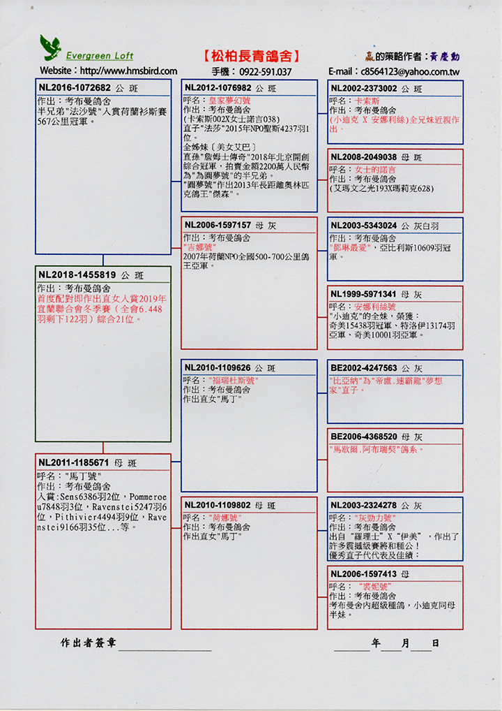 鴿舍連絡人:黃慶勳 電話:0922-591.037 03-8562.665 FAX:03-8576.779