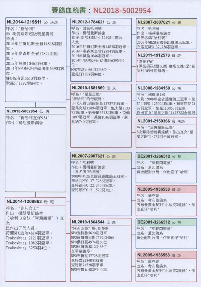 “新哈利直仔954” NL18-5002954 斑公 中文翻譯血統書
