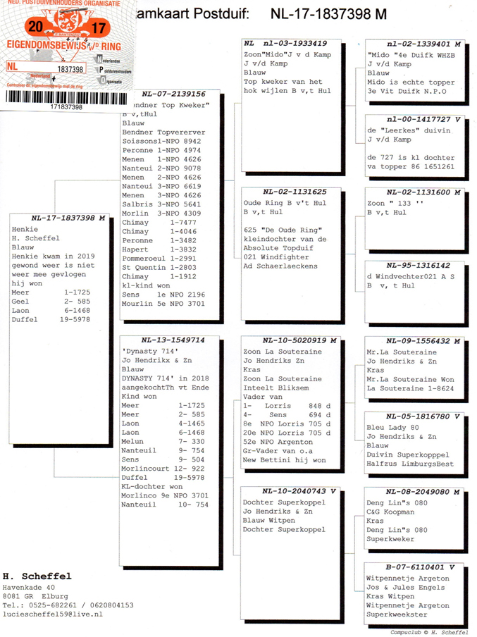 “小本德納”為荷蘭漢克. 薛飛爾的基礎種鴿。他的母親“蘿拉”(Laura)出自荷蘭艾沃特.范德霍斯特(Evert van der Horst Azn),她與艾迪.夏拉肯鴿系密切相關。 “利馬”(Lima),傑出賽雌 愛德文為“小本德納”準備的配對雌鴿之一就是“利馬”,她的血統書說明了原因。她是荷蘭佛布利父子(Verbree Combination)的“利蒙治”(Limo)的直女。“利蒙治”為傑出天賦種鴿,作育了子代“馬奇諾”(Marchino NL08-1158499)和“安妮塔”(Anita NL10-1326498)。