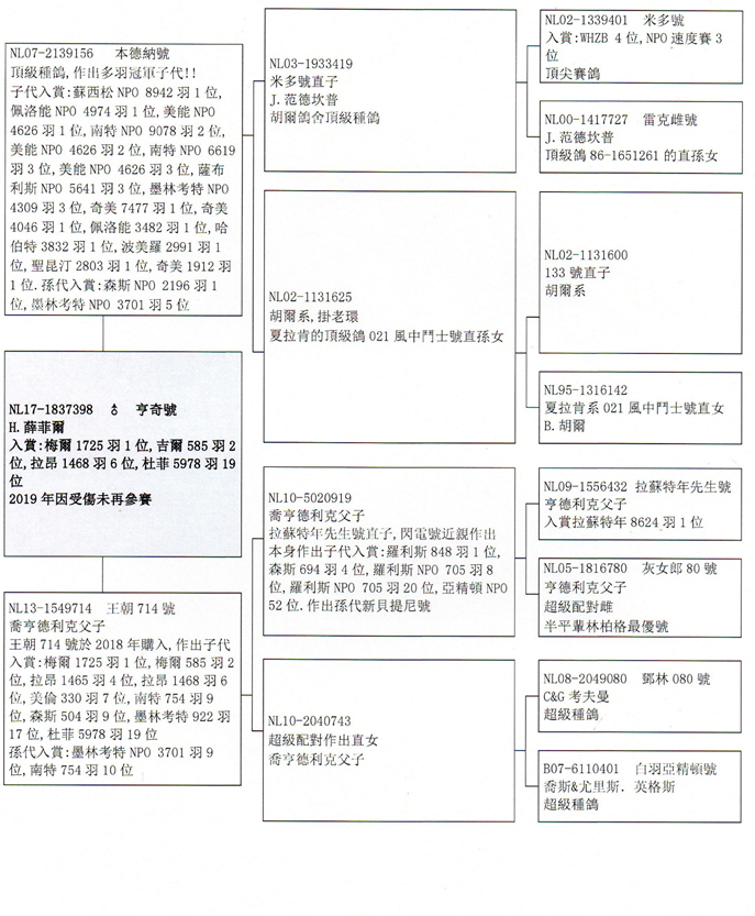佛蘭斯.提曼門斯從夏拉肯鴿舍引進血系後,育出一系列頂級賽鴿;其中有一羽是叫”坎美萊恩.邦費爾”(Camelion Bonfire)灰公,跟“年輕邦費爾”來自同一家族,牠參與競翔比賽的成績證明,總是飛在領先群的真正優秀賽鴿才可能呈現的比賽成績。 年輕邦費爾(Jonge Bonfire NL09-1957884灰母)住進漢克.薛飛爾鴿舍時年紀輕,有多羽牠作出的直子女毫不考慮直接參賽了,成績當然是嚇人的好,在平均2,300羽參賽的比賽入賞記錄:冠軍、冠軍、冠軍、亞軍、三位、五位、七位、八位以及九位。 “本德納”與”年輕邦費爾”作出的新一代優秀種鴿:”雅各”與戴安娜小姐(Lady Diana)的配對,這一對新的配對日後更是形成---頂級配對。新配對作出的兩個鴿子,其中令人印象深刻的是”奇美2014”(Chimay 2014),下代在7,380羽賽鴿參賽的比賽裡,為漢克贏得了1、2、3、4、5位的好成績。 荷蘭新一代強豪艾德溫.胡格蘭(Edwin Hoogland) 在薛飛爾.漢克鴿舍已經找到了完美的種鴿來源,而且他還定期地引本德納的後代。本德納的直子x勞拉在艾德溫的鴿舍,已經作出7羽冠軍鴿的入賞記錄。 一位年輕的鴿友尼克-揚.科恩德斯(Nico-Jan Koenders),當他住在偉思特福特(Westervoort)的時候,曾為了鴿舍裡著名種鴿”茲拉坦”(Zlatan)和牠的全兄弟”湯姆斯”(Thomas)找適配種母鴿傷透腦筋。茲拉坦入賞荷蘭WHZB鴿王第二位,他必須要能夠找到頂級種母鴿,才可以保持這羽優秀種公高水準的競翔品質。 2005年,尼可-揚向佛蘭斯.提曼門斯買了”坎美萊恩.邦費爾”與漢克·謝菲爾用他的年輕邦費爾作出的斑比(Bambi)姐妹鴿配對,所作出的兩羽直女。牠當時配對的母鴿是藍色奇蹟的全妹,尼可-揚帶著”艾思蓋普”(Escape 05-73)與她的妹鴿名叫”奇蹟小姐”(Lady Miracle 05-13),兩位漂亮的灰色母鴿回家。 當尼可-揚買下這兩羽母鴿時,他一定不知道,這兩羽種母是多麼頂級的育種材料,但他很快就會找到答案。他沒有讓這對姐妹鴿去參加比賽,而是直接將牠們送進種鴿舍執行育種工作。奇蹟小姐作出一羽羽叫達娜拉(Danara)母鴿,他將這羽母鴿送去他的朋友威爾和法爾科.爾班(Wil and Falco.Ebben)的鴿舍參賽,用比賽測試牠的競翔能力,結果是馬上大獲全勝。幼鴿時期,牠在16,971羽賽鴿參賽的莫爾蘭庫爾(Morlincourt)比賽裡,獲得NPO(Netherlandse Postduivenhouders Organisatie荷蘭全國賽鴿協會)的第二位。一歲鴿齡在7,917羽賽鴿參賽的布盧瓦(Blois)比賽獲得第一個NPO冠軍。 奇蹟小姐作出的直子女們在平均7,500羽賽鴿參賽的前十次NPO比賽裡,獲得其中的四次入賞;牠的姐妹鴿”艾思蓋普” (Escape 05-73)作出的4羽不同的下代,在平均5,500羽參賽鴿的比賽裡,都獲得過冠軍入賞。毫無疑問,所有的入賞鴿都來自同一血緣。