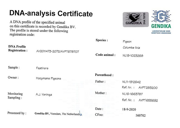 ●母鴿:NL16-1663787 “葛蘿莉婭新哈利787”,胡曼斯與凡登伯格聯合育種之成果