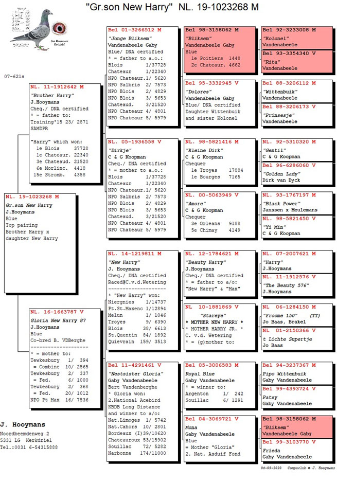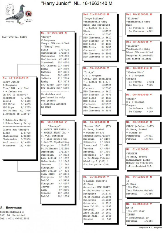 查看過去4年內“帥氣哈利”的後代取得的眾多頂級成績。楊很快注意到這些幼鴿全部出自同一羽雌鴿。這羽雌鴿就是克裡斯坦.範德維特令鴿舍的 “星眼”(Stareye)。楊.胡曼斯竭盡全力將“星眼”帶到自己鴿舍,非常奇怪的是他並沒有將其與“帥氣哈利”配對,而是與他的標誌雄鴿“哈利”配對。我們都知道後來發生了什麼:“星眼”是“哈利”的最後配對雌鴿之一,她正是“小哈利”的母親。因此 “小哈利”作為“哈利”的直子成為“帥氣哈利”的同父半兄弟,還是“新哈利”的同母半兄弟。