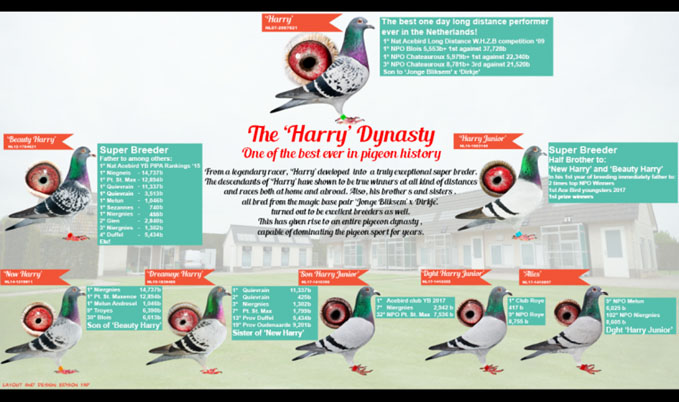 “小哈利”和他的半兄弟“帥氣哈利”(NL12-1784621 Beauty Harry)或多或少都是相同水準。“帥氣哈利”在2012年出生,出自“哈利”X “美麗雌576”(NL11-1912576 The Beauty 576),其中“美麗雌576”為“年輕閃電號”X“小迪克雌”的直孫女。2014和2015年楊.胡曼斯見證了“帥氣哈利”作育了天賦幼鴿,其中包括獲得2項大羽數比賽冠軍的“新哈利”,他正在沿著祖父“哈利”的足跡迅速成長。還在強烈逆風(西北和東北)取得較大領先優勢。“新哈利”在第一個育種季(2017年)便顯示了他的育種天賦。他是“帥氣哈利”的天賦子代中的佼佼者。