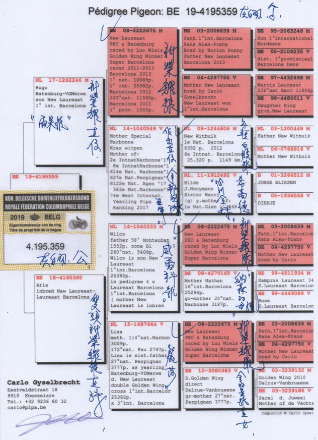 2019年巴塞隆納國際16.051羽13位(荷蘭全國5位)NL16-1508442灰白羽.母。