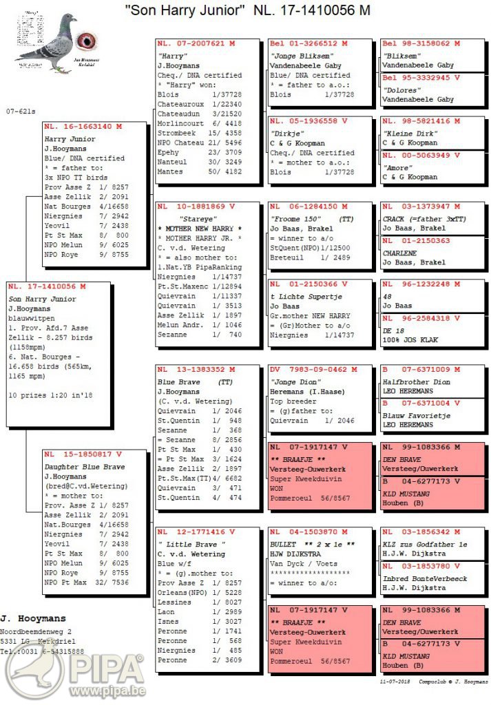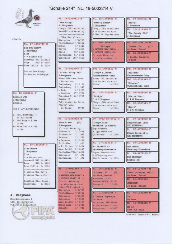 楊.胡曼斯全部最佳鴿的子代和孫代都被放到克裡斯坦.範德維特令的賽鴿舍進行測試,截止目前這樣的策略非常成功。得益于楊.胡曼斯賽鴿的出色表現,克裡斯坦獲得2018年WHZB荷蘭全國最佳鴿友頭銜。最重要的是,他還憑藉楊.胡曼斯名鴿“新哈利”的孫女“簡妮“獲得南圖全國14.422羽幼鴿冠軍。查看“簡妮”的血統書