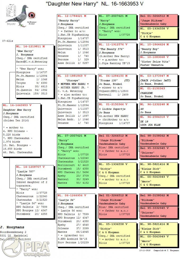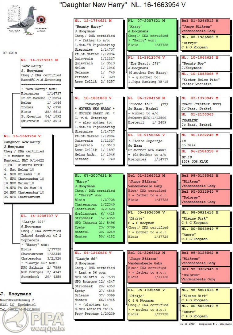 “新哈利”全兄 “麥克斯”(Max)獲得2015年PIPA排行榜全國中距離幼鴿鴿王冠軍。“新哈利”擁有非常光彩奪目的比賽生涯,獲得尼爾尼斯14,737羽冠軍,蓬聖麥森斯1.294 羽冠軍和莫倫1.046羽冠軍,之後他就被轉入種鴿舍。他作育的子代和孫代現在獲得眾多頂級成績,我們現在來看一下他的後代在2018年獲得的驕人戰績: