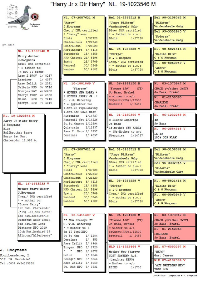 查看過去4年內“帥氣哈利”的後代取得的眾多頂級成績。楊很快注意到這些幼鴿全部出自同一羽雌鴿。這羽雌鴿就是克裡斯坦.範德維特令鴿舍的 “星眼”(Stareye)。楊.胡曼斯竭盡全力將“星眼”帶到自己鴿舍,非常奇怪的是他並沒有將其與“帥氣哈利”配對,而是與他的標誌雄鴿“哈利”配對。我們都知道後來發生了什麼:“星眼”是“哈利”的最後配對雌鴿之一,她正是“小哈利”的母親。因此 “小哈利”作為“哈利”的直子成為“帥氣哈利”的同父半兄弟,還是“新哈利”的同母半兄弟。