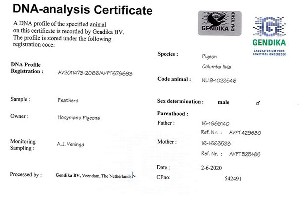 “小哈利直仔546” NL19-1023546 灰公 D.N.A.檢驗證明書