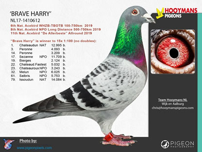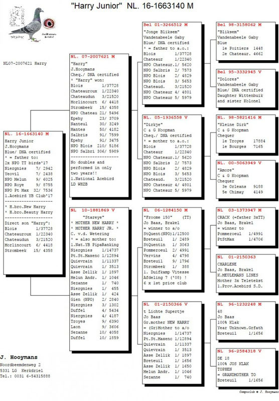 精心考慮的育種策略讓楊的超級賽鴿和種鴿“哈利”取得了眾多育種成績。截止目前“哈利”絕對是同樣的傳奇育種配對“年輕閃電號”X“迪克雌”的最重要後代。這對配對讓楊.胡曼斯享譽全世界。“哈利”為楊.胡曼斯成功賽鴿生涯寫下重要篇章:“哈利”憑藉布洛瓦37.728羽冠軍和查特路22.340羽冠軍獲得2009年WHZB全國22.340羽鴿王冠軍,他的子代和孫代取得的佳績多到無法盡數收集。僅僅2017年“哈利”的子代和孫代便贏得了27項冠軍(沒有重複)包括4項NPO冠軍和1項地區1全國冠軍。要知道這些都只是列出了2017年的成績。