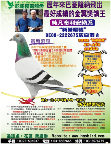 五、2018世界信?冠軍錦標賽暨FCI國際公棚?,台灣第一次舉辦310公里決賽,是台灣史上最高規格的一次國際賽。3月27日決賽,本舍入賞2羽:14位 (17-880177班母)及74位(17-880176灰公),2羽皆是新榮耀號直孫作出。