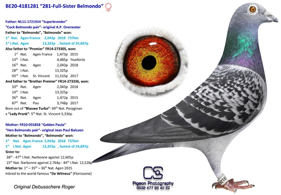 入賞阿讓國際賽荷蘭全國 (一歲鴿組 11.572羽)冠軍為愛迪.佛頓(Fortuin Ad)鴿舍,該舍冠軍鴿NL17-1262008班母,是在比利時時間6月30日(星期六)早上06時05分:50秒歸巢,翔距911.736公里,創下平均分速948.9米/分,此鴿同時也是荷蘭全國參賽阿讓國際賽交鴿總數10.530羽的總冠軍鴿。
