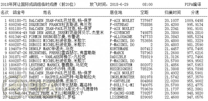 阿讓國際賽成鴿組總冠軍為法國巴甘恩.楊-保羅(Balcaen Jean-Paul)鴿舍
