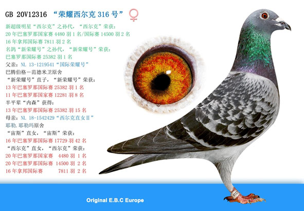 祖父鴿:NL08-2222675灰白羽.公 “新榮耀號”,2013年巴塞隆納國際25.382羽冠軍。