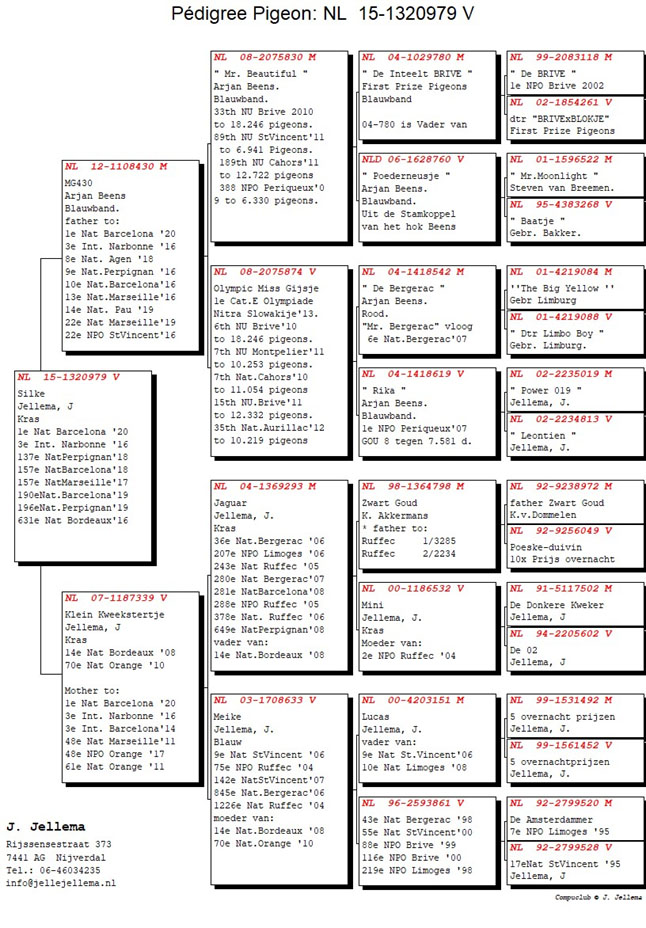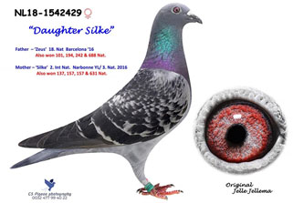 如果2014年巴賽隆納國際冠軍“小碧玉”和“希爾克”有一個共同點的話,那就是“黑金”(NL98-1364798 Zwart Goud)。首先“小碧玉”是“黑金”的直孫女,“希爾克”的母親“小種母”(Klein Kweekstertje)也是“黑金”的直孫女。“希爾克”的父親是“MG430”(NL12-1108430 MG430),名字裡的“MG”代表“蓋西小姐”(Miss Gijsje)。“MG430”是2013年尼特拉奧林匹克E類代表鴿“奧林匹克蓋西小姐”(NL08-2075874 Olympic Miss Gijsje)的直子,“奧林匹克蓋西小姐”來自亞裡.賓斯(Arjan Beens)。在2018年離開前,MG430都是耶勒瑪最優秀的種鴿。他的子代還獲得2016年巴賽隆納全國10位。“希爾克”的母親“小種母”(NL07-1187339 Klein Kweekstertje)是一羽天賦種雌,已作育子代獲得2014年巴賽隆納國際季軍(絲薇號)。