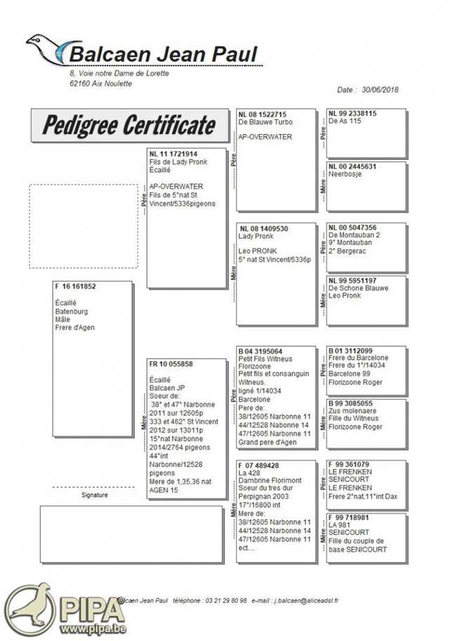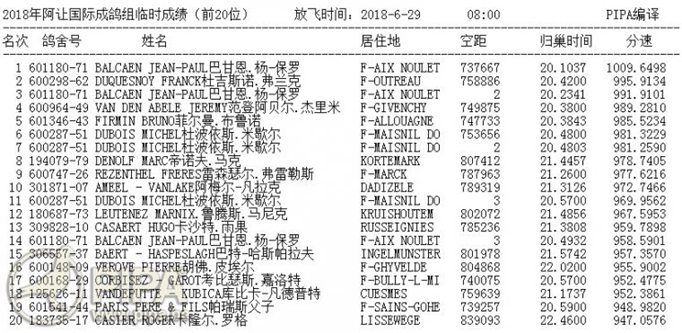 獲得阿讓國際賽成鴿組13.325羽總冠軍為法國巴甘恩.楊-保羅(Balcaen Jean-Paul)鴿舍,該舍冠軍鴿FR16-161852斑公,是在比利時時間6月29日(星期五)晚上20時10分7秒歸巢,翔距737.665公里,創下平均分速1009.65米/分。