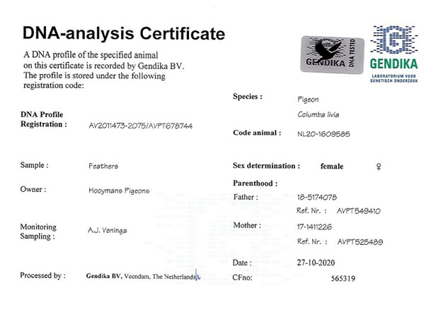 “新哈利近親585” NL20-1609585斑母 D.N.A.檢驗證明書