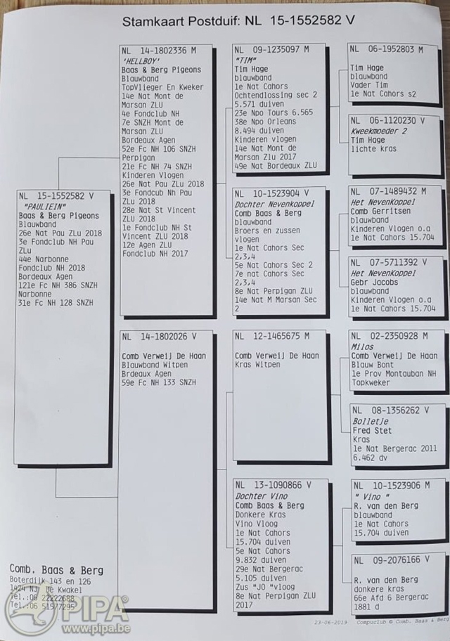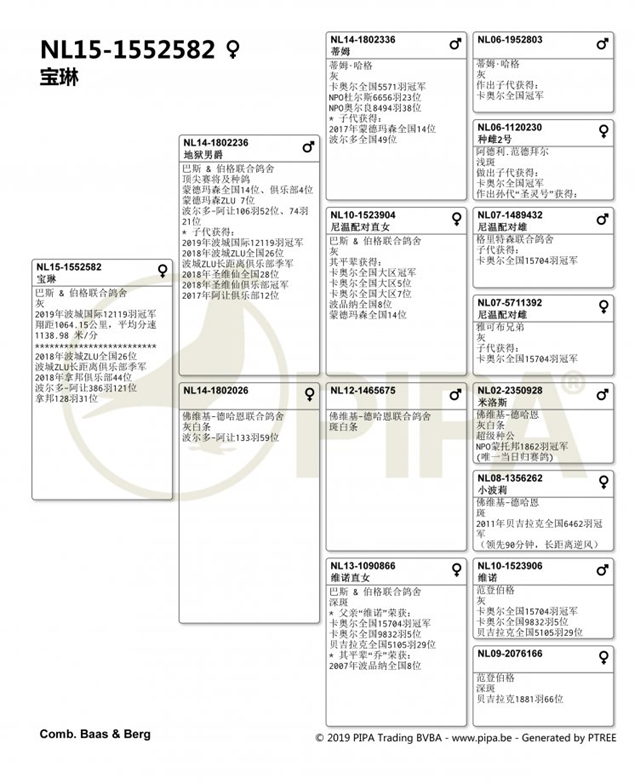 2019年波城(Pau)國際賽12.119羽冠軍鴿NL15-1552582灰母 中文翻譯血統書
