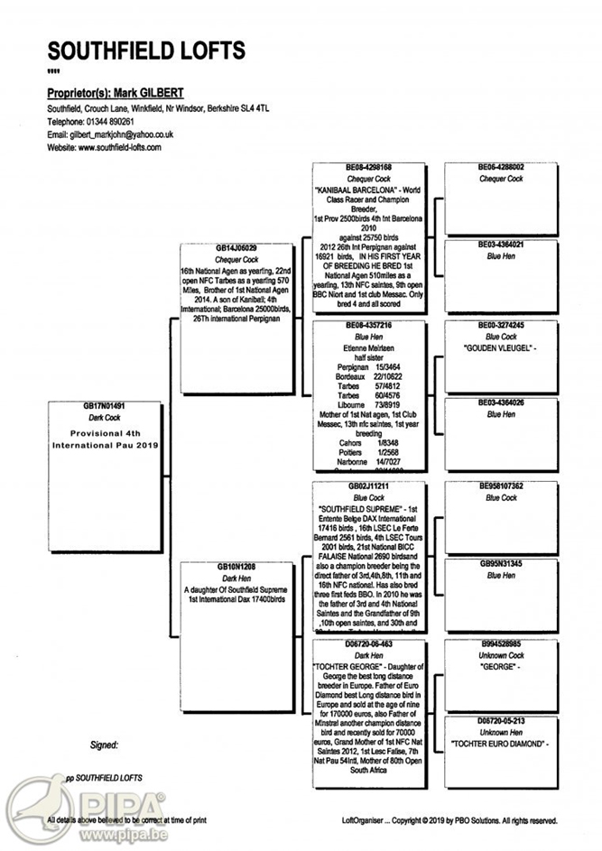 2019年波城英國全國冠軍鴿GB17-N01491斑公(國際12.119羽4位)血統書