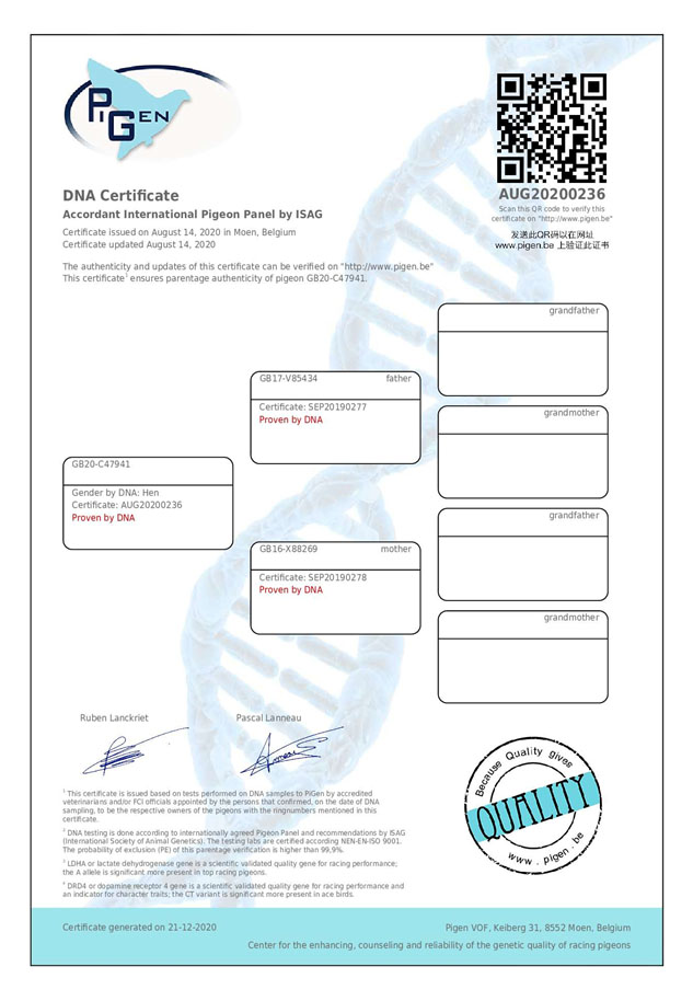 “金巴塞隆納941” GB20-C47941 灰母 D.N.A.檢驗證明書