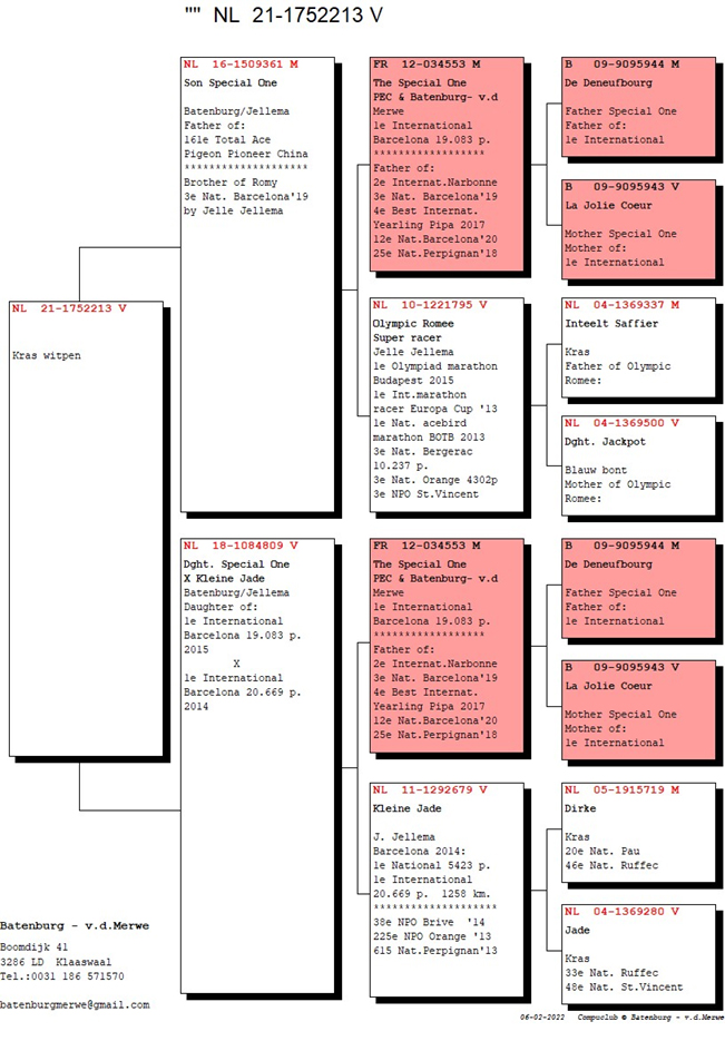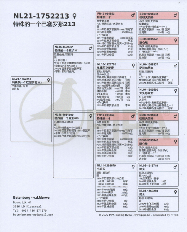 特殊的一個近親213” NL21-1752213斑母 中文翻譯血統書