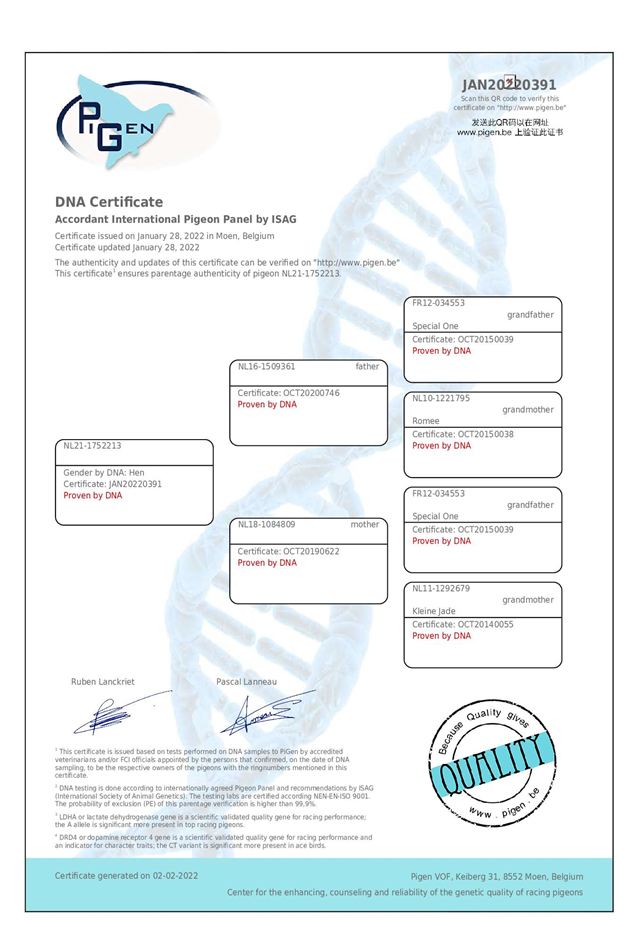 特殊的一個近親213” NL21-1752213斑母 D.N.A.檢驗證明書