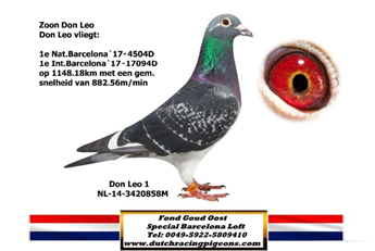 ● 祖父鴿:NL10-3025405斑公 ”蘇美爾戰將”,獲得2017年巴塞隆納國際17.094羽總冠軍鴿(是歷年最艱難的一次巴塞隆納國際賽)。