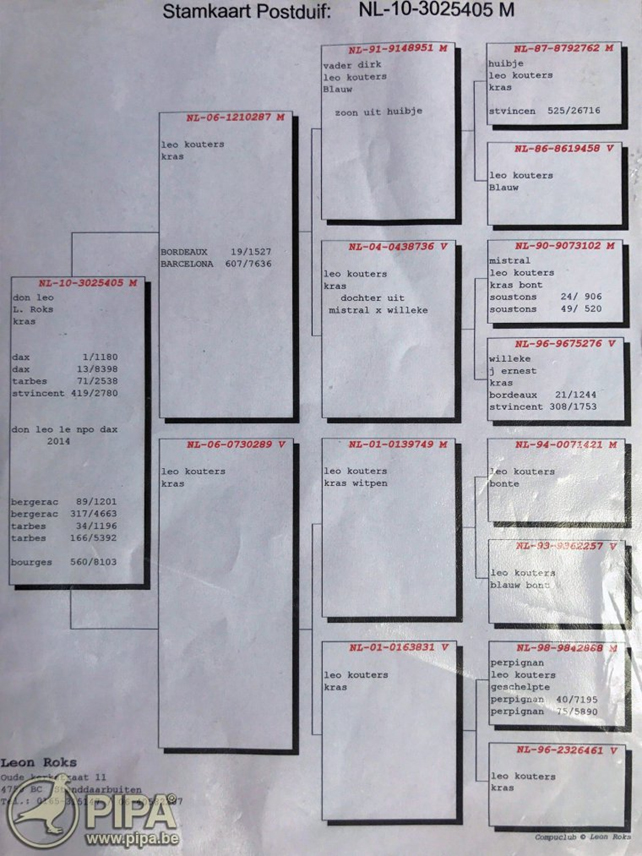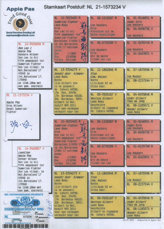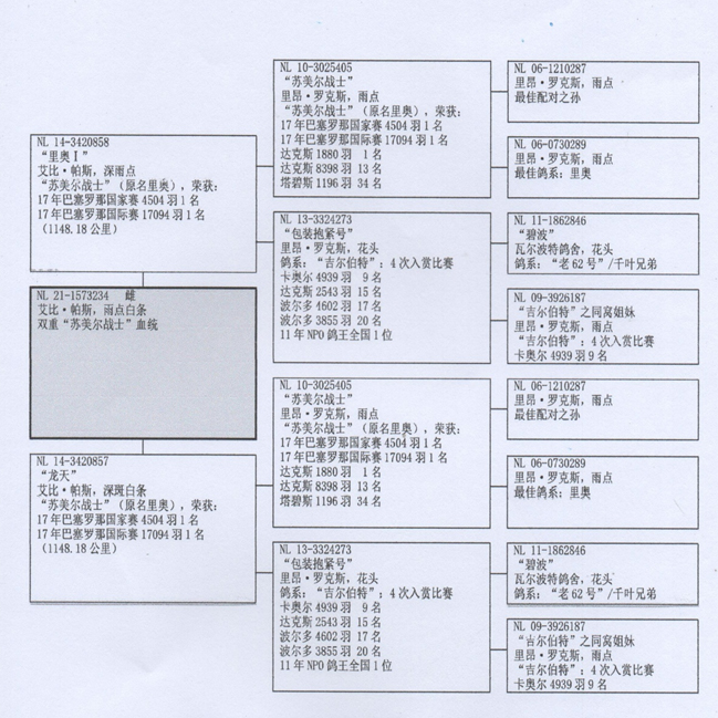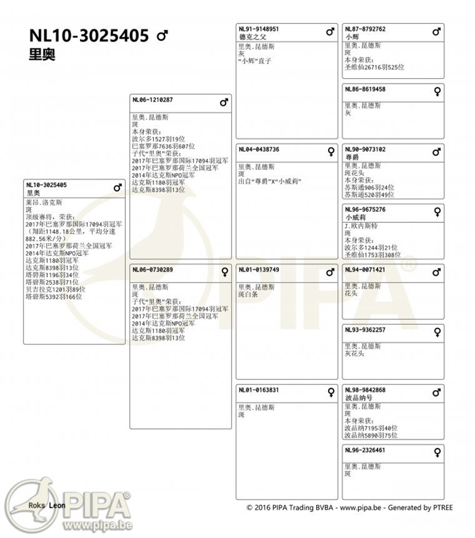 ● 外祖父鴿:NL10-3025405斑公 ”蘇美爾戰將”,獲得2017年巴塞隆納國際17.094羽總冠軍鴿(是歷年最艱難的一次巴塞隆納國際賽)。