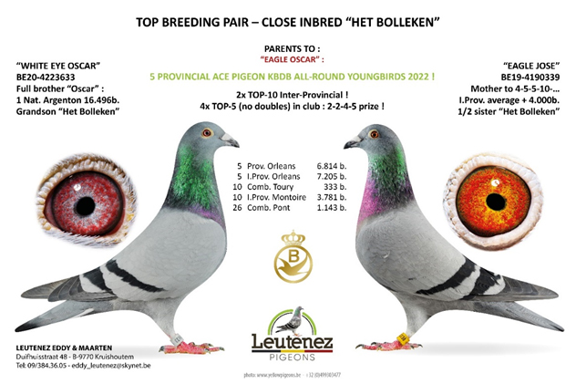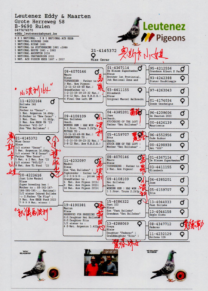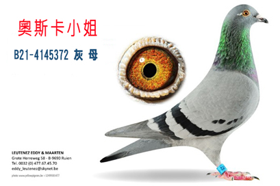 “奧斯卡號B18-4034402灰公”, 2018年比利時亞精頓19.818羽總冠軍。全弟”白眼奧斯卡號B20-4223633灰公”作出2023年查特盧斯II全國16.537羽總冠軍及比利時幼鴿組中距離KBDB全國鴿王亞軍。( B23-4180041灰公”新奧斯卡” )。