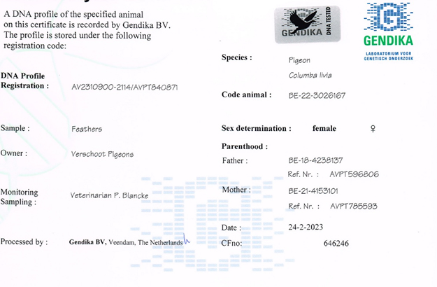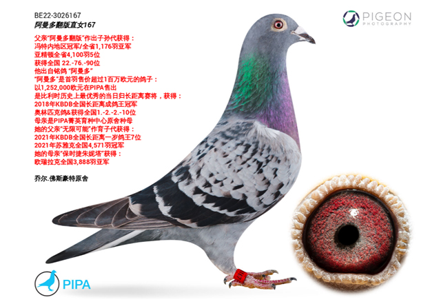 父親出自首羽售價超過100萬歐元的銘鴿“阿曼多”,是“阿曼多”的超級育種型直子