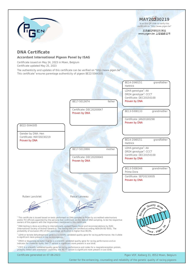 ●母鴿:BE17-5013866“帽子戲法直女866” ,出自2羽波治全國冠軍配對“帽子戲法”X“霹靂朵拉”