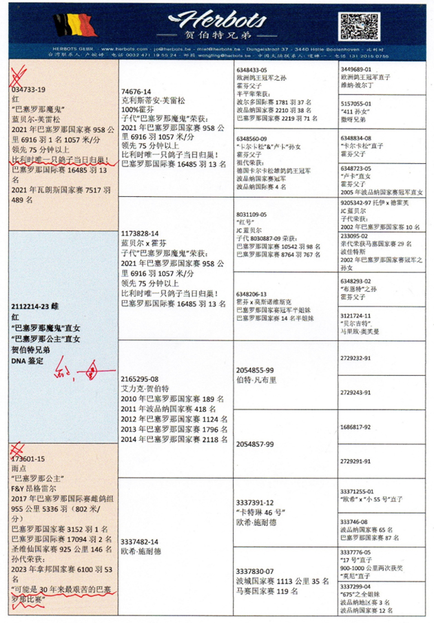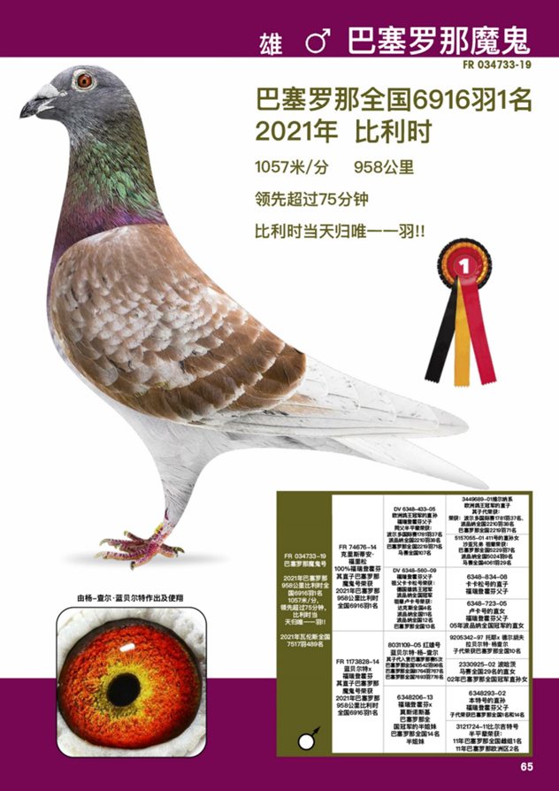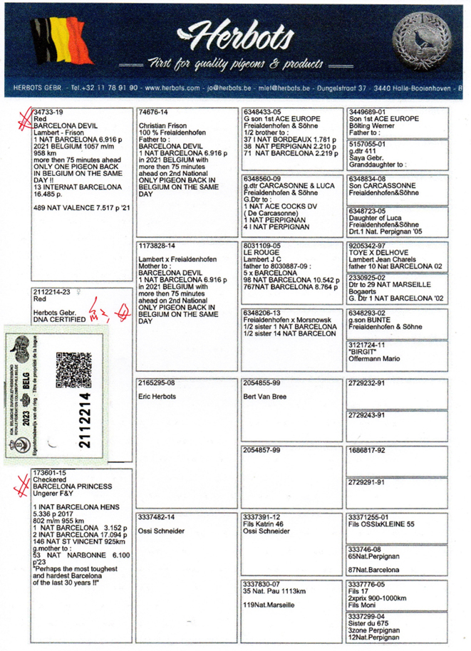 DNA 驗證 父親:FR34733-19 “巴賽隆納魔鬼”, 放飛當天比利時唯一的一羽歸返鴿! 2021年巴賽隆納國家賽比利時6.916羽1名 ,1057 米/分 958 公里。 母親: FR173601-15 “巴賽隆納公主”,2017年巴賽隆納國際賽雌鴿組 5.366 羽1名,955 公里 分速802米/分,巴賽隆納國際賽 17.094羽2名。"也許是過去30年來最艱苦、最困難的巴賽隆納賽 !!" 孫代榮獲:2023年巴賽隆納國家賽6.100羽53名。
