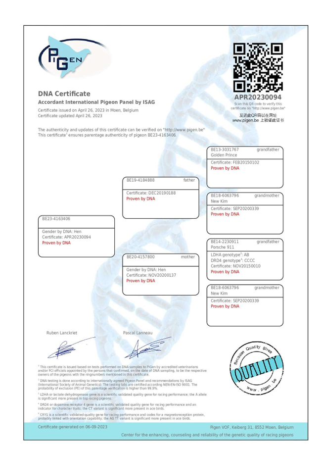 “新金姆近親406” B23-4163406灰母 D.N.A檢驗證明書.
