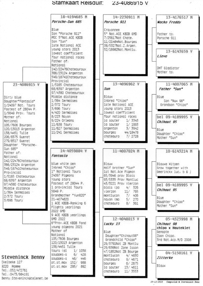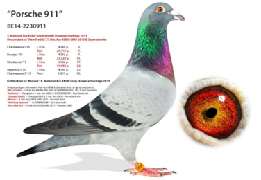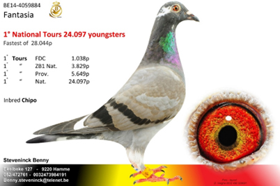 2014年比利時杜爾斯國家賽幼鴿24,097羽冠軍,總數28.044羽總冠軍”夢想曲”直女。