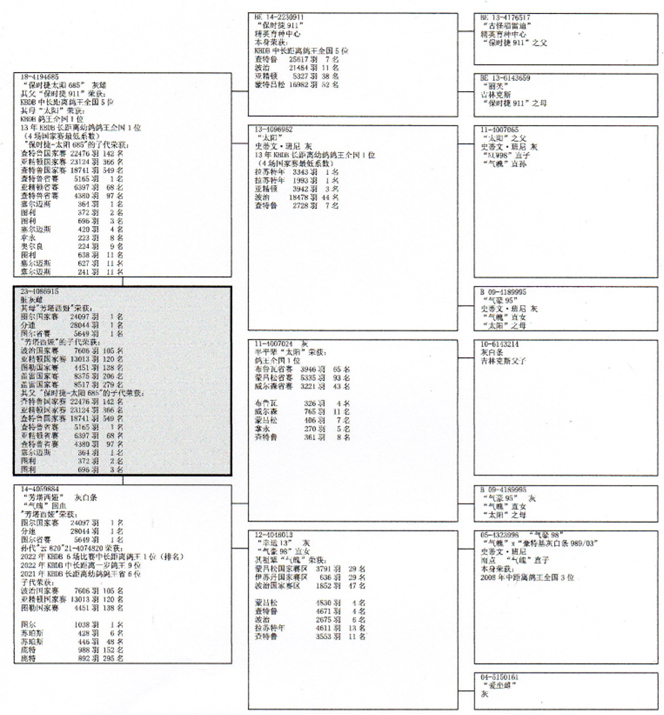 母鴿:“夢想曲”B14-4059884灰母,2014年比利時杜爾斯國家賽交鴿總數28.044羽總冠軍。